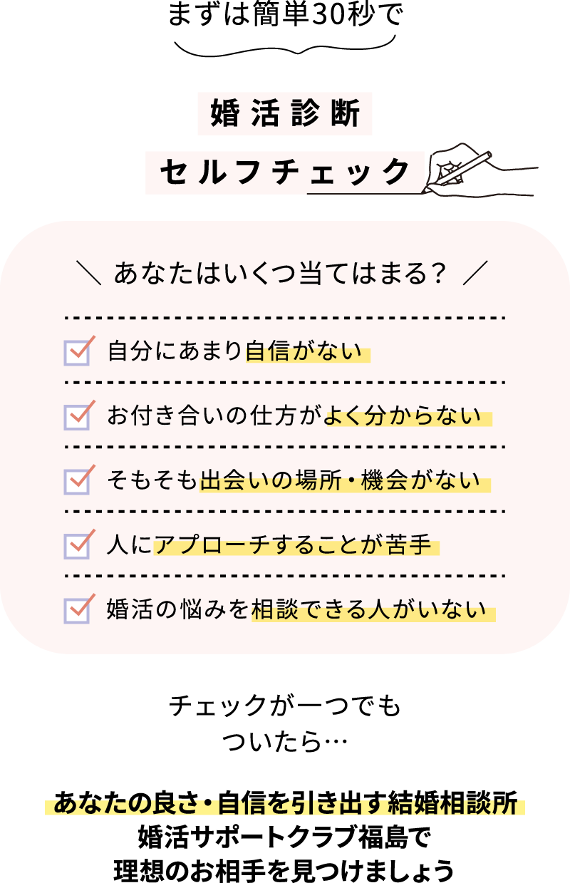「結婚に真剣な人」の中からお相手探し×婚活カウンセラーのフルサポ ートで、お付き合いからプロポーズまでが驚くほどスムーズに進みます。福島での結婚に強い結婚相談所が、全力でお手伝いします。